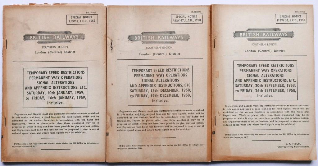 | 70 | BR(ScR) booklet ‘Temporary Speed Restrictions, Permanent Way Operations etc’. SW No.11 dated 17th March 1956. 70pp. Plus similar No.29 dated 21st July 1956 and No.39 dated 29th September 1956. | £20 |  |