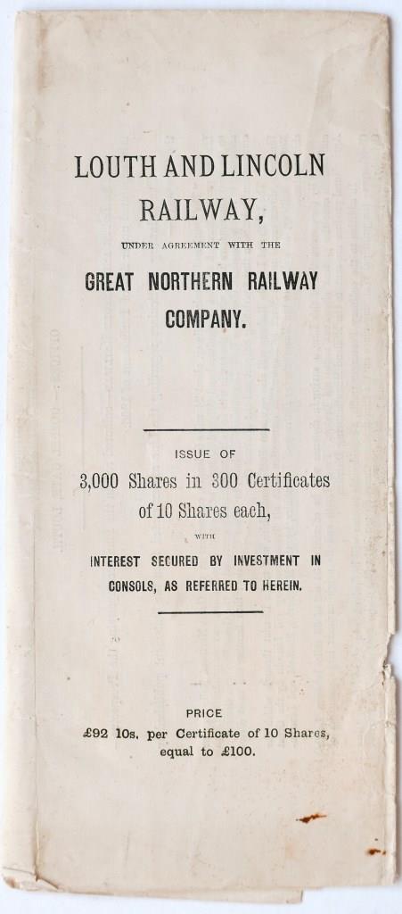 | 625 | Louth and Lincoln Railway Company prospectus for the sale of 3000 shares in the company. 4pp dated 1872. | £24 |  |