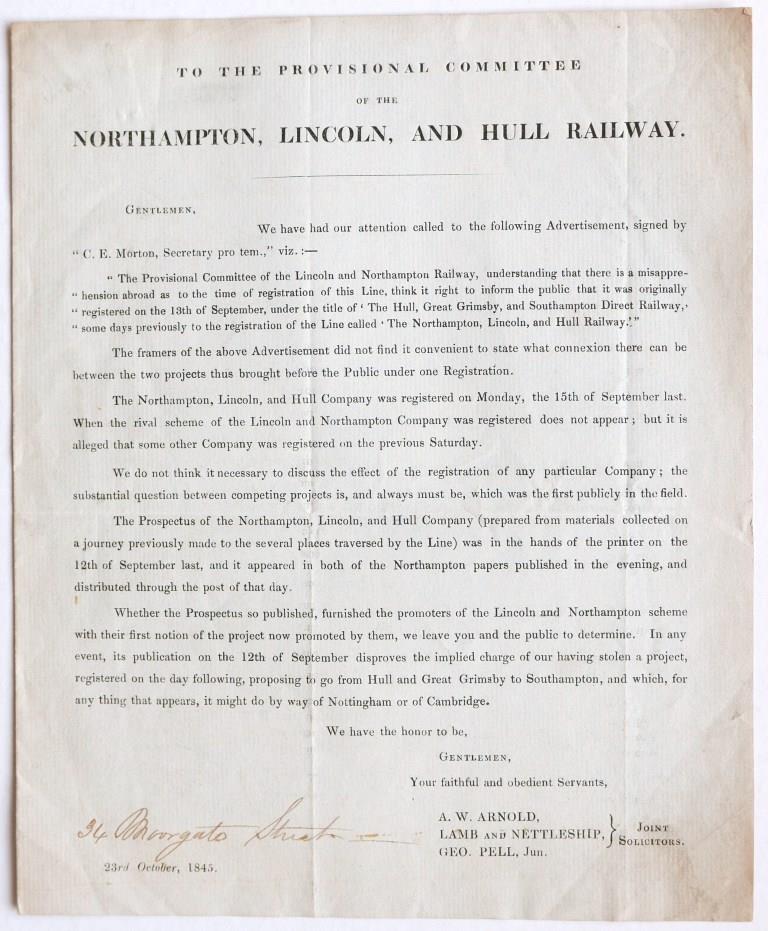 | 627 | Northampton, Lincoln and Hull Railway pre printed letter to the provisional committee re the proposed railway. Dated October 1845. | £8 |  |