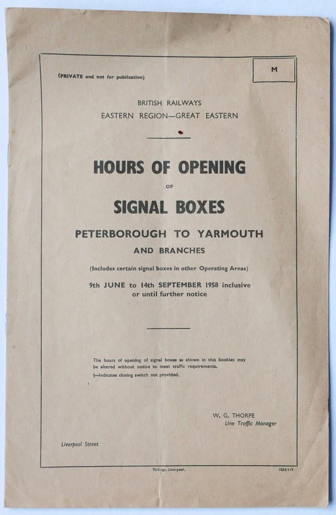 | 80 | BR(E) booklet ‘Hours of Opening Signal Boxes Peterborough to Yarmouth & branches’. 7pp dated June 1958. | £10 |  |