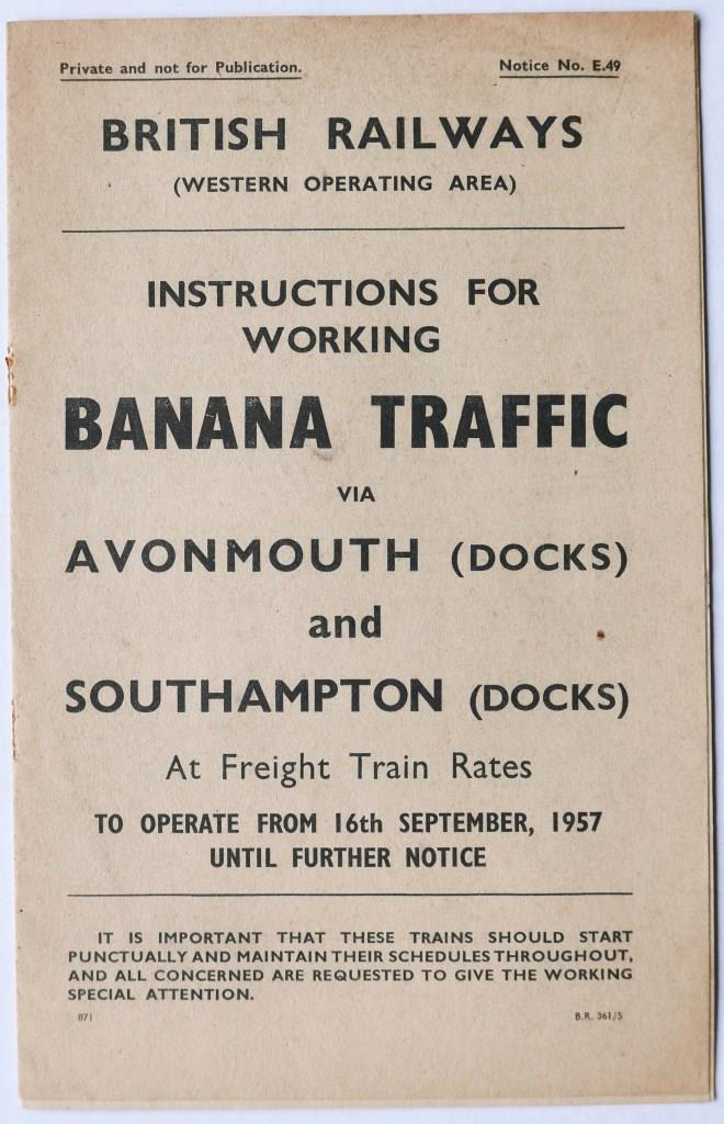 | 64 | BR(W) notice No.E49 ‘Instructions for Working Banana Traffic via Avonmouth Docks and Southampton Docks at freight train rates’. Dated September 1957. 12pp. | £22 |  |