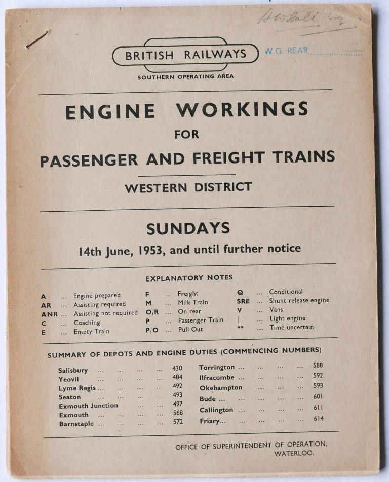 | 65 | BR(S) Western District booklet ‘Engine Workings for Passenger and Freight Trains – Sundays’. Card covers, 29pp, dated June 1953. | £38 |  |