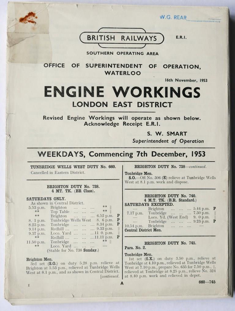 | 66 | BR(S) London East District booklet of revised engine workings for weekdays. 60+pp dated December 1953. | £110 |  |