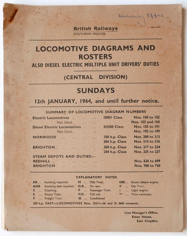 | 93 | BR(S) Central Division ’Locomotive Diagrams and Rosters - also DEMU Drivers’ Duties - Sundays’. 40pp dated January 1964. | £8 |  |