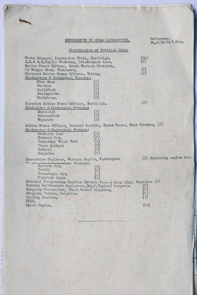 | 99 | BR(S) 9 page typescript report ‘Experiments on Steam Locomotives’ detailing work on mostly West Country and Merchant Navy type locos circa 1957 – 1963. | £2 |  |