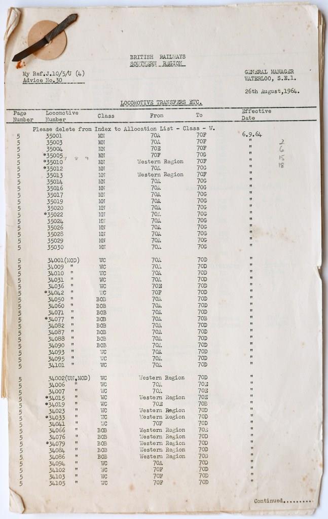 | 101 | BR(S) 20 typescript page list of locomotive transfers and withdrawals. Dated 1964. | £70 |  |