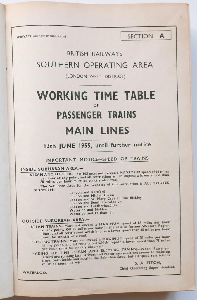 | 108 | BR(S) London West District sections A – C, Southern District sections E & F, Western District section J working timetable of passenger trains. 800+pp in hardback covers, dated June 1955. | £32 |  |
