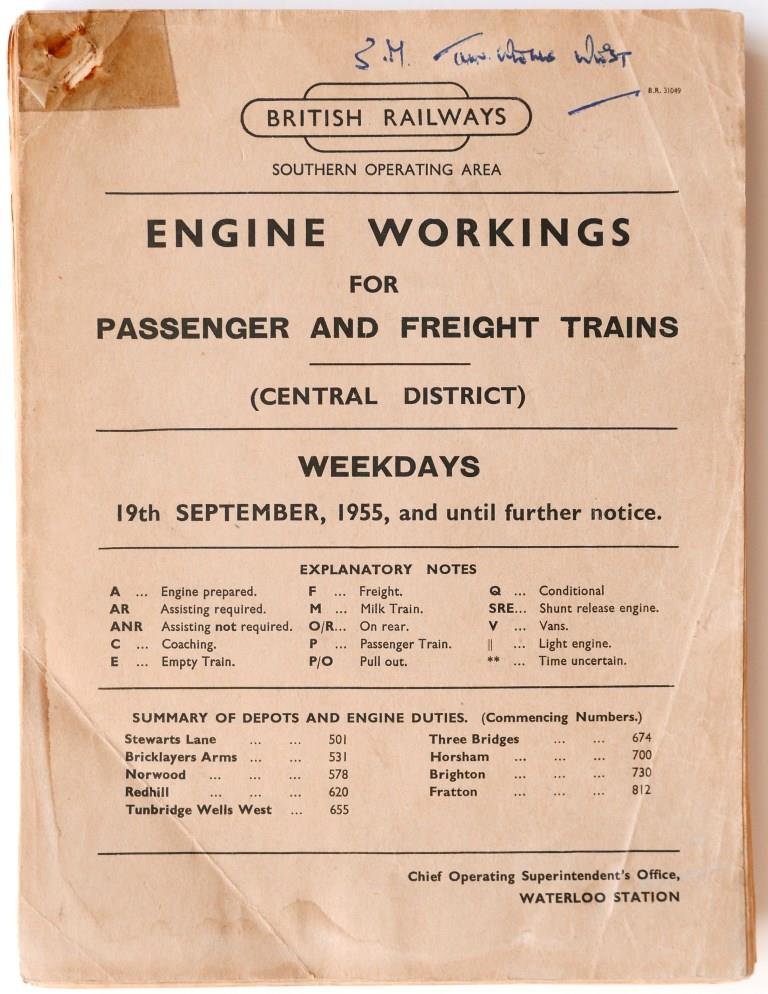 | 111 | BR(S) Central District booklet ‘Engine Workings for Passenger and Freight Trains – Weekdays’. Card covers, 166pp, staple removed, dated September 1955. | £5 |  |