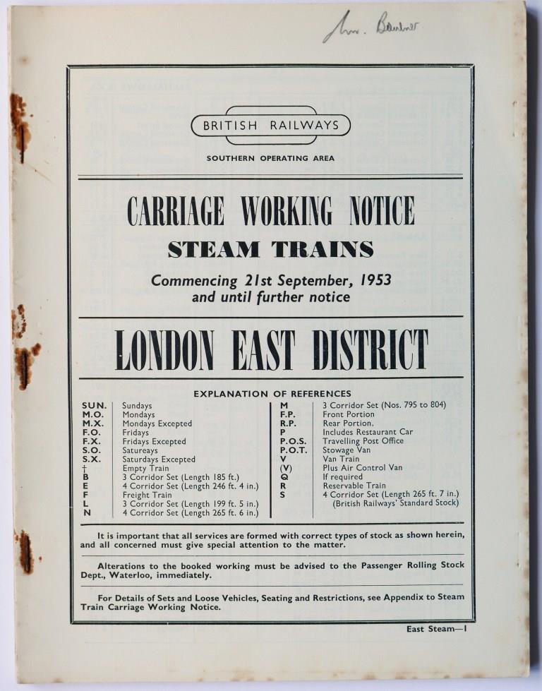 | 116 | BR(S) London East District Carriage Working Notice Steam Trains. 124pp dated September 1953. | £13 |  |