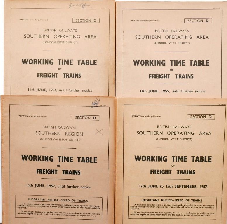 | 120 | BR(S) London West District section D working timetable of freight trains, 102pp dated June 1954. Plus similar dated June 1955, June 1957, June 1959. | £38 |  |