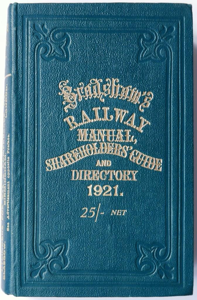 | 27 | Bradshaw’s published ’Railway Manual, Shareholders Guide’ dated 1921. Green cloth bound hardback covers with title in gold on front, 702pp plus maps. | £30 |  |