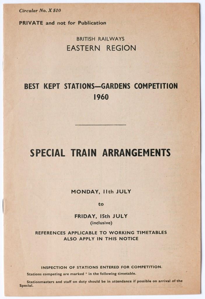 | 59 | BR(E) ‘Special Train Arrangements’ circular No.X510 re Best Kept Stations - Gardens Competition. 6pp dated 11th – 15th July 1960. | £22 |  |