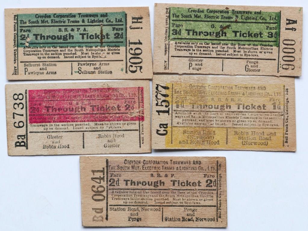 | 714 | 5 Croydon Corporation Tramways and South Met Electric Trams & Lighting Company ‘Through Ticket’ geographical punch type tickets. Values 1d – 3d. | £38 |  |