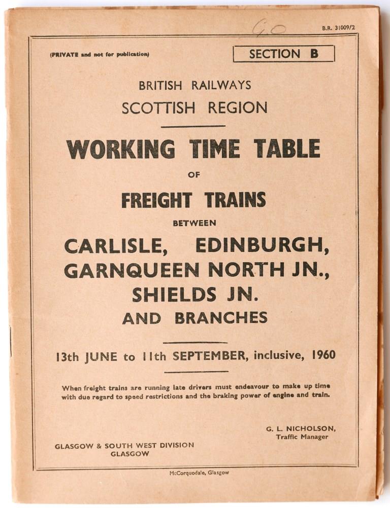 | 84 | BR(ScR) section B working timetable of freight trains between Carlisle, Edinburgh, Garnqueen North Junction, Shields Junction and branches. 68pp, dated June 1960. | £26 |  |