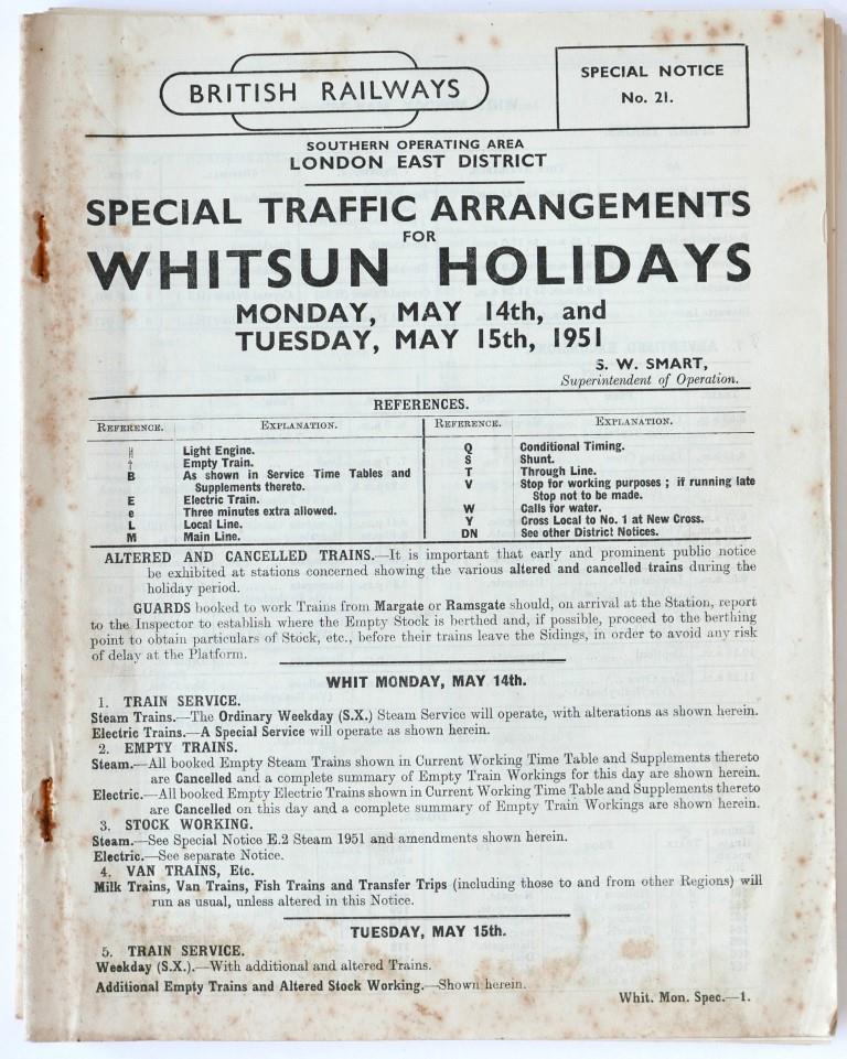 | 111 | BR(S) London East District Special Traffic Arrangements special notice No.21 re Whitsun Holiday Period May 1951. 243pp, staples removed causing separation of sections. | £2 |  |
