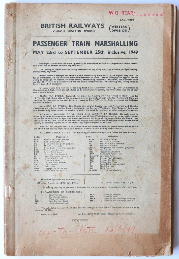 | 115 | BR(M) Western Division ‘Passenger Train Marshalling’ booklet. 132pp dated May 1949. Staples removed causing separation of segments. | £210 |  |