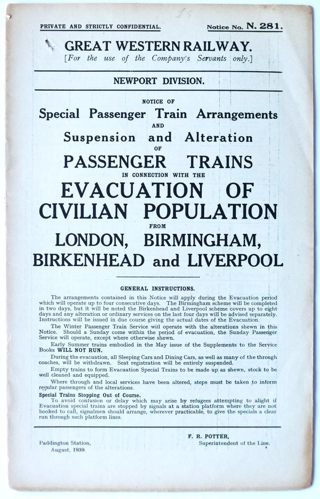 | 698 | SR London West, Southern and Western Divisions Evacuation Notice No.2W 1940 ’Special Train Arrangements in Connection with Evacuation of London’. 36pp, heavily annotated on front cover. | £65 |  |