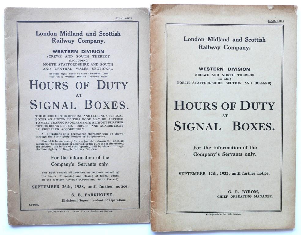 | 105 | Five BR(M) Western Division booklets ‘Hours of Duty at Signal Boxes – Crewe and North thereof including North Staffordshire Section’. Each 40+pp dated September 1952, September 1954, September 1957, November 1959, September 1962. | £56 |  |