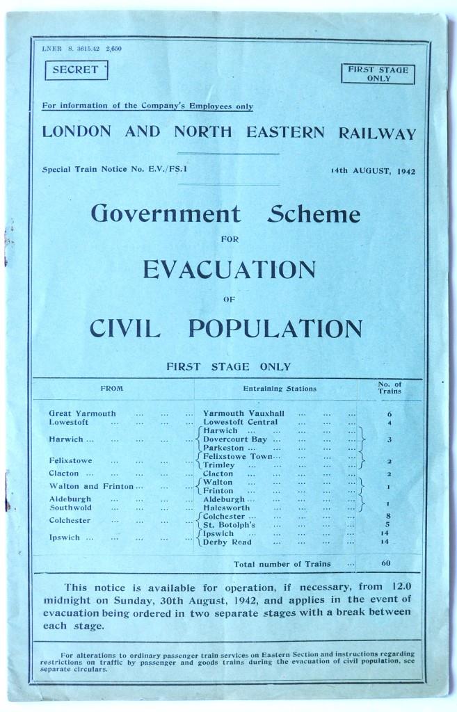 | 697 | SR London East and London Central Divisions Evacuation Notice No. 1E 1940 ’Special Train Arrangements in Connection with Evacuation of Dartford, Crayford, Welling, Erith, Belvedere, Abbey Wood, Swanscombe, Northfleet, Gravesend, Rochester, Chatham and Gillingham’. 14pp, dated 1940. | £42 |  |