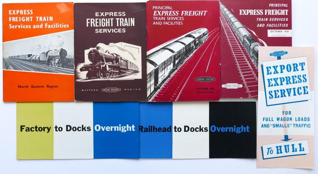 | 61 | 4 BR ‘Express Freight Train Services and Facilities’ booklets. LM Region issues dated October 1958 and October 1959, NE Region May 1958, Western Region July 1957. Plus 3 glossy leaflets for services to docks for the export of goods (1950s). | £55 |  |