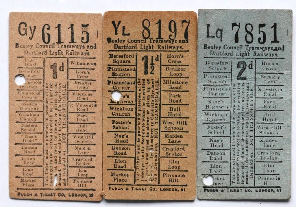 | 719 | 3 Bexley Council Tramways and Dartford Light Railways geographical punch type tickets. Values 1d, 1½d and 2d. | £18 |  |