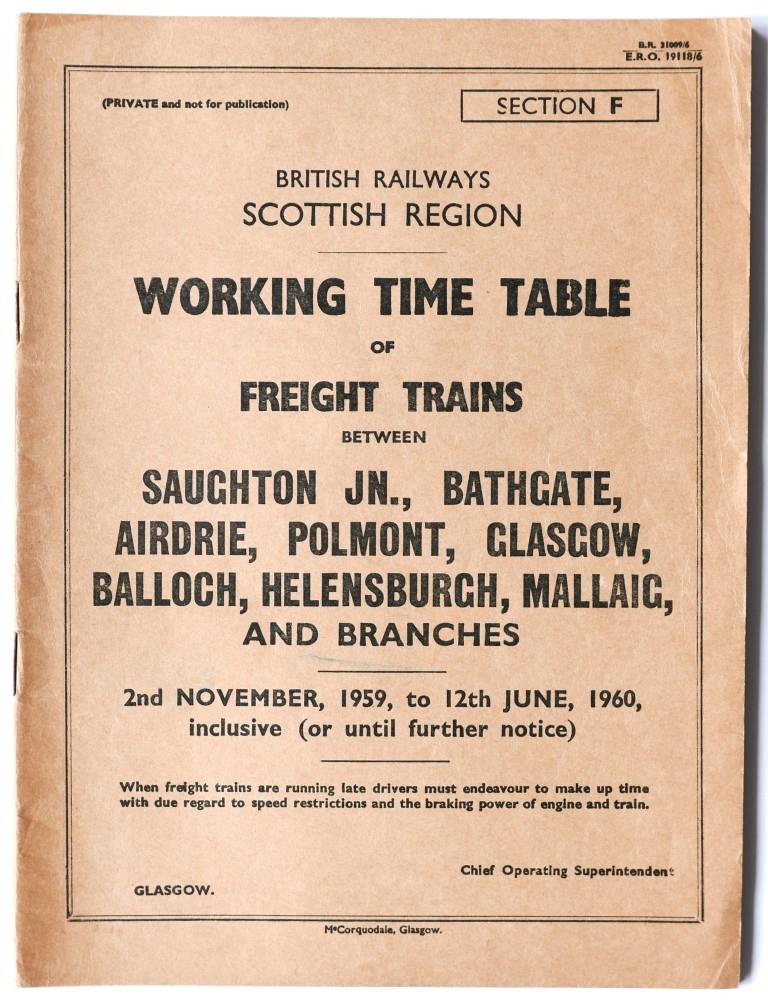 | 75 | BR(ScR) section F working timetable of freight trains between Saughton Junction, Bathgate, Airdrie, Polmont, Glasgow, Balloch, Helensburgh, Mallaig and branches. 36pp dated November 1959. | £24 |  |