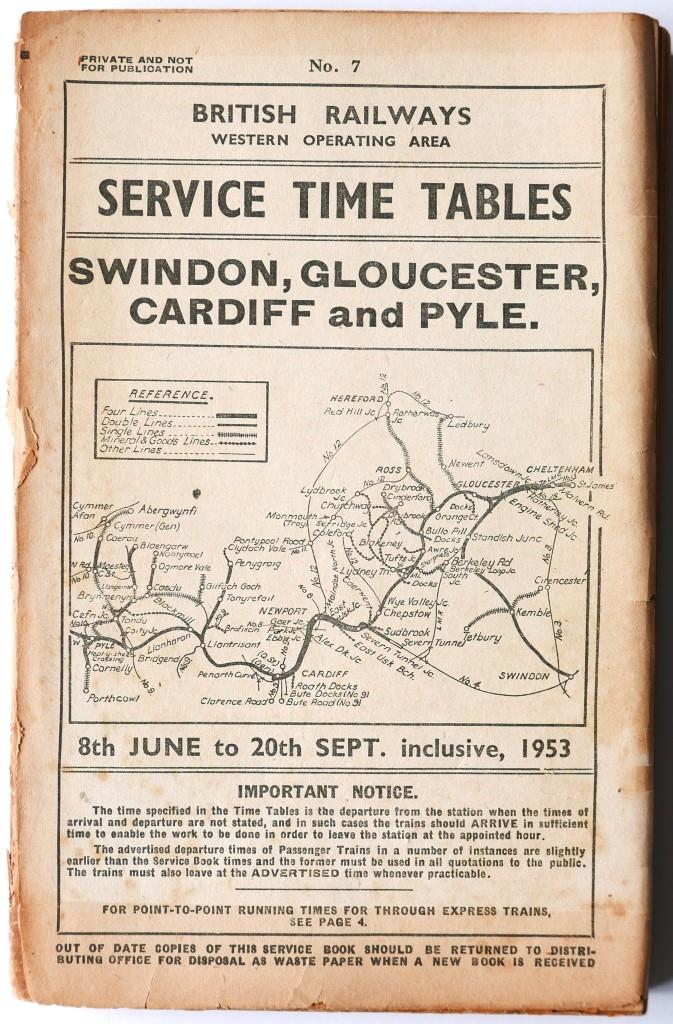 | 83 | BR(W) No.7 section service timetable covering Swindon, Gloucester, Cardiff and Pyle. 361pp, dated June 1953. Disbound, front page detached. | £11 |  |