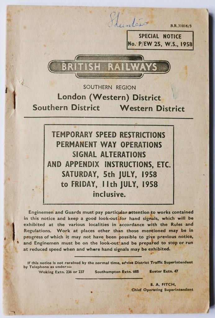 100 | BR(S) London (Western), Southern, Western Districts notice No. P/EW25 re temporary speed restrictions, permanent way operations etc. 102pp dated 5th July 1958. | £26 |  |