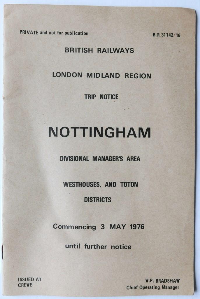 105 | BR(M) booklet ‘Trip Notice Nottingham Divisional Manager’s Area Westhouses and Toton Districts’. 12pp dated May 1976. Plus 2 typescript page amendment dated April 1976. | £11 |  |