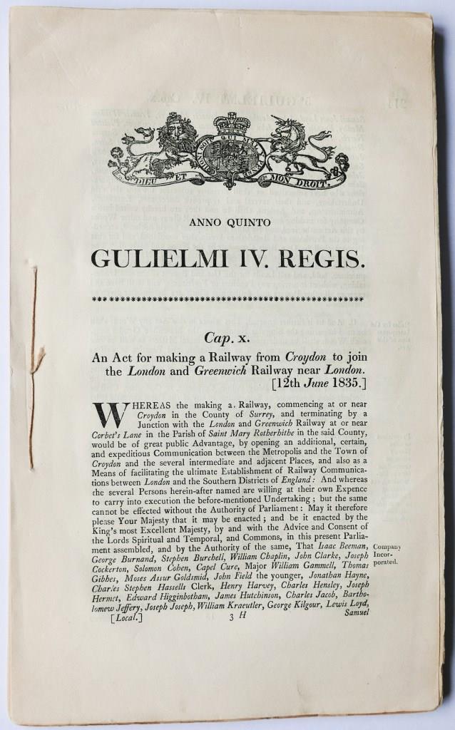 24 | Act for making a railway from Croydon to join the London and Greenwich Railway near London. 96pp dated June 1835. | £36 |  |