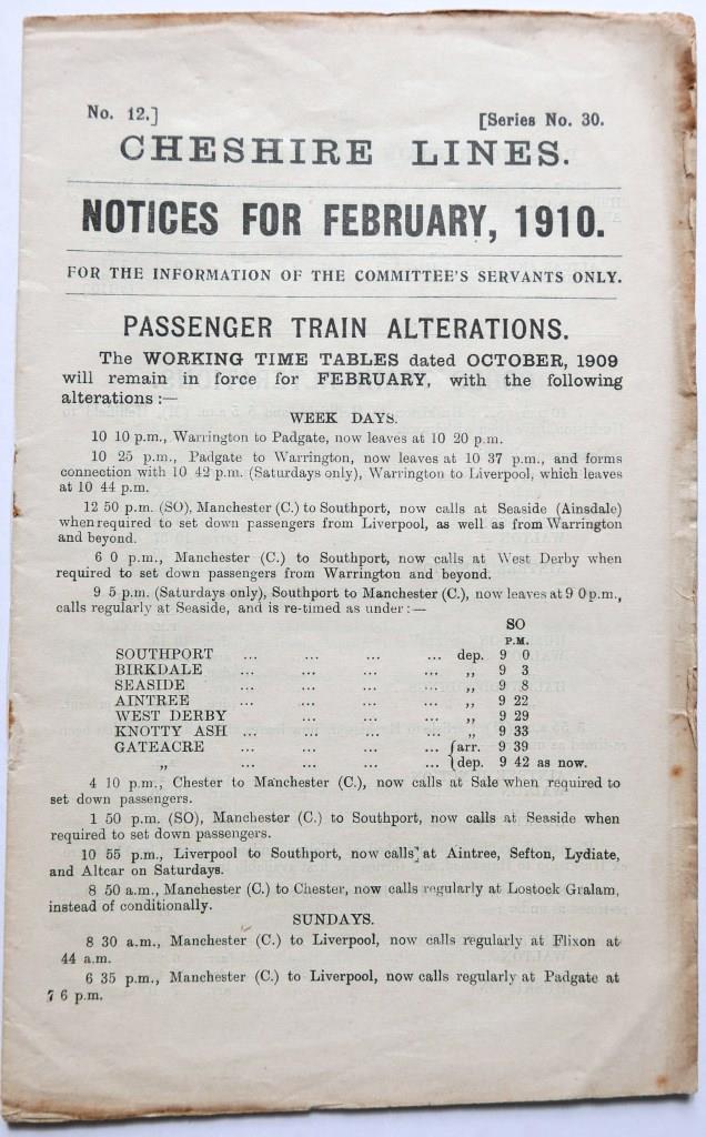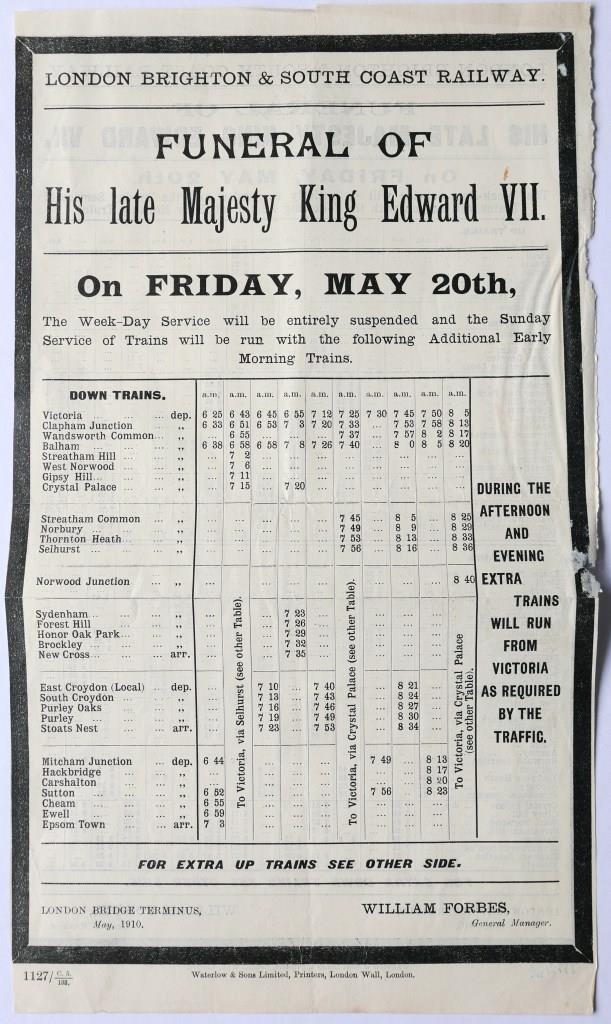 644 | LBSCR foolscap sized handbill showing altered service for the funeral of King Edward VII on May 20th 1910. Trimmed at side edges. | £2 |  |