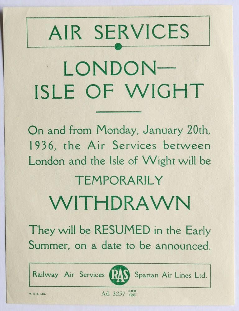38 | Railway Air Services and Spartan Air Lines smaller sized handbill announcing the temporary withdrawal of services between London and the IOW. Green print, dated January 1936. | £9 |  |