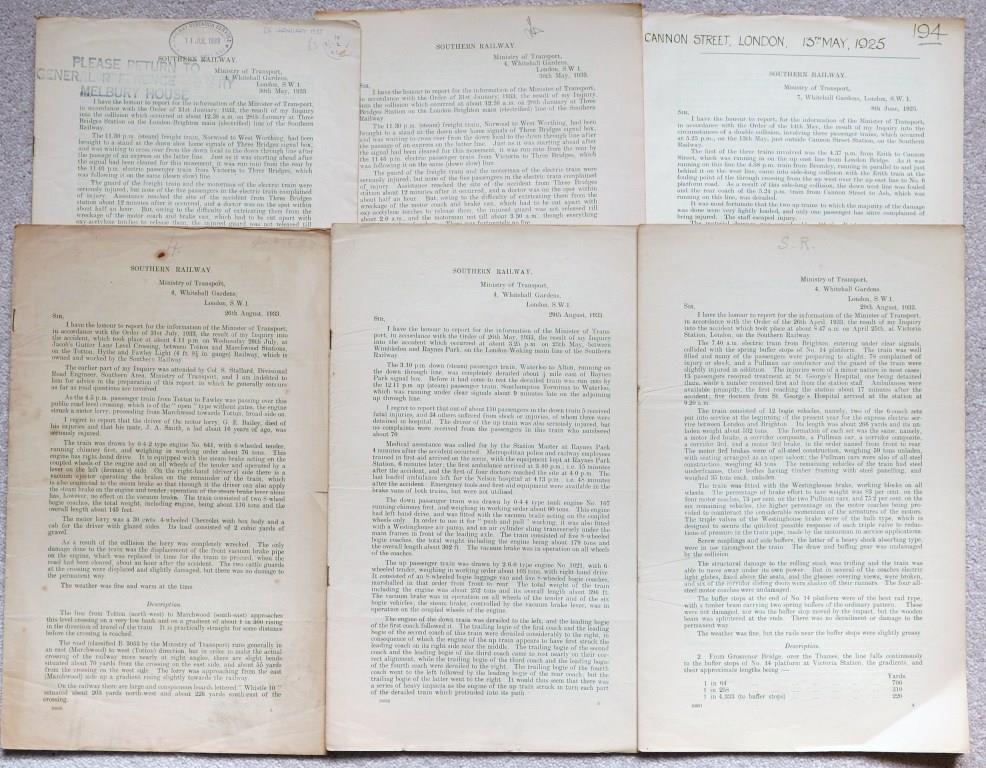 4 | 6 reports into accidents and collisions on the SR. Totton July 1933, Wimbledon May 1933, Victoria April 1933, Three Bridges January 1933 (x2), Cannon Street May 1925. | £5 |  |