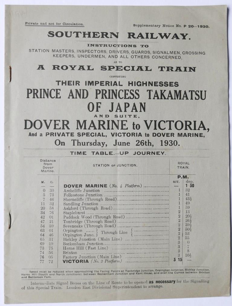 639 | BR(S) supplementary notice No.P20 dated June 26th 1930 re royal train for the Prince and Princess Takamatsu of Japan from Dover Marine to Victoria. 6pp, folded. | £11 |  |