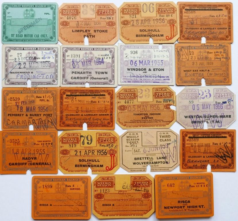 734 | Approx 30 GWR 1st or 3rd class season tickets. Includes 1 ‘By Road Motor Car Only’ (stamped specimen). Approx half issued. Duplication. | £32 |  |