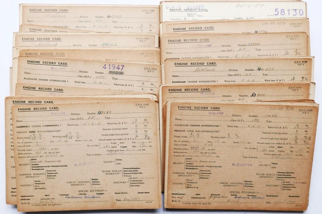85 | Approx 125 BR Engine Record Cards for ex Midland Railway and LMS locos. Various loco types, many tank locos noted. | £310 |  |