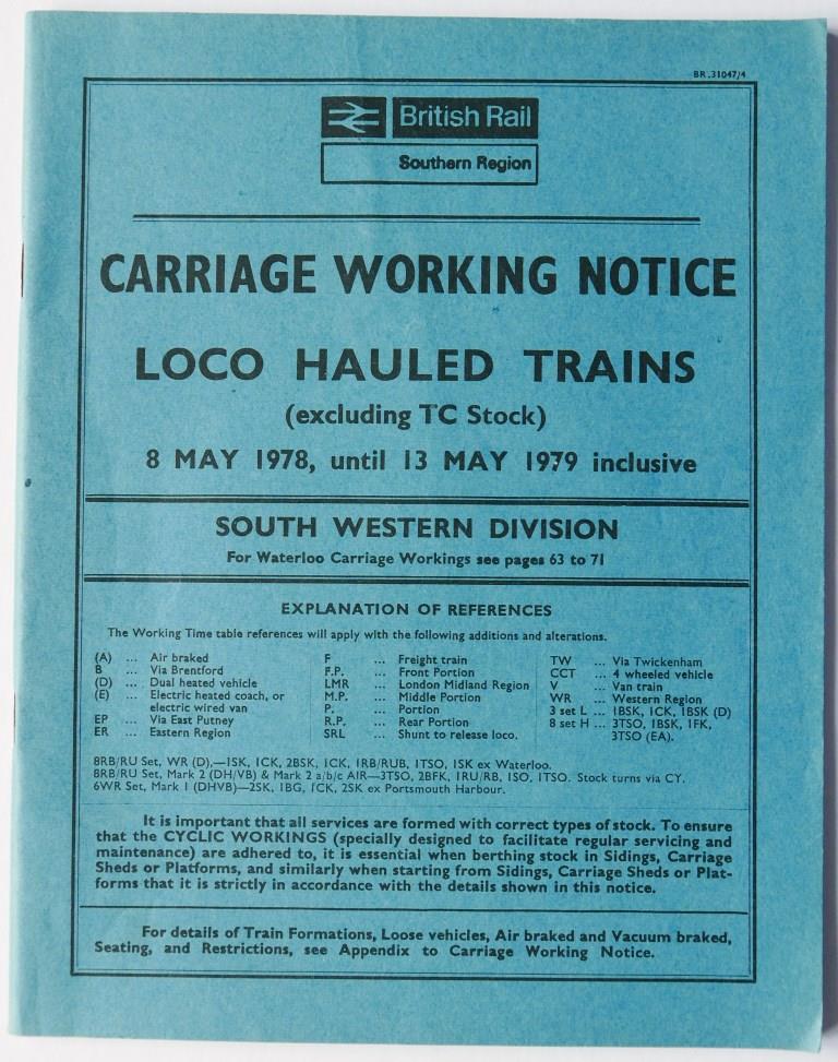 93 | BR(S) South Western Division Carriage Working Notice ‘Loco Hauled Trains excluding TC stock’. Blue covers, 71pp dated May 1978. | £26 |  |