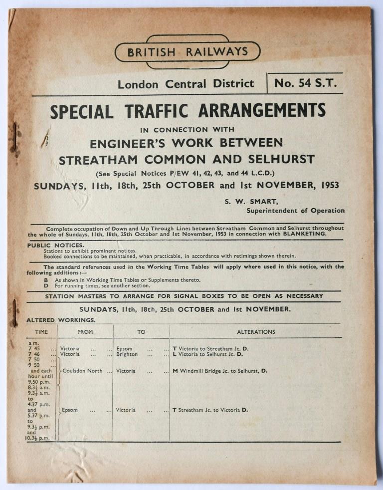 96 | BR(S) Special Traffic Arrangements Notice No.54 re engineer’s work between Stratham Common and Selhurst. 24pp dated October 1953. | Not Sold |  |