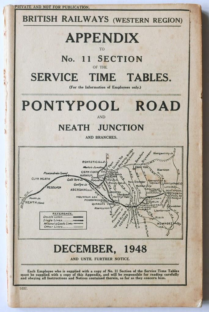116 | BR(W) Appendix to No.11 section of the service timetable covering Pontypool Road and Neath Junction area. 75pp dated December 1948. | £13 |  |