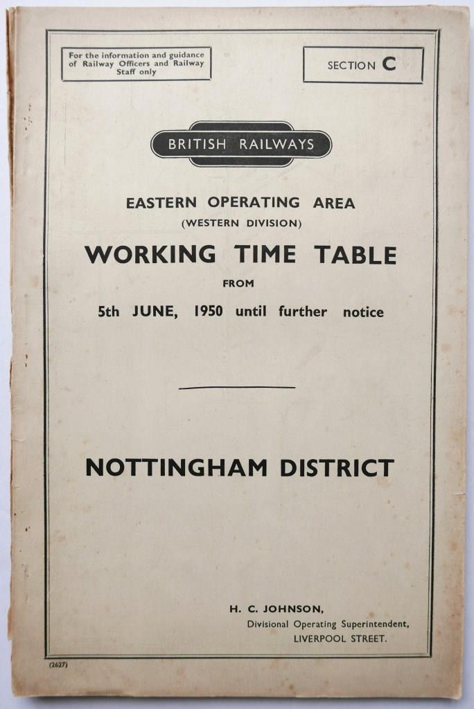 123 | BR(E) Western Division section C working timetable Nottingham District. 123pp dated June 1950. Rear cover partially detached. Plus alterations supplement dated June 1950. | £26 |  |