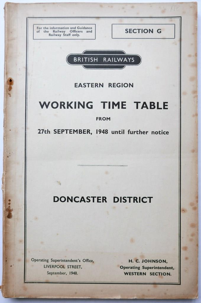 124 | BR(E) section G working timetable Doncaster District. 176pp dated September 1948. Foxing to edges of covers. | £24 |  |