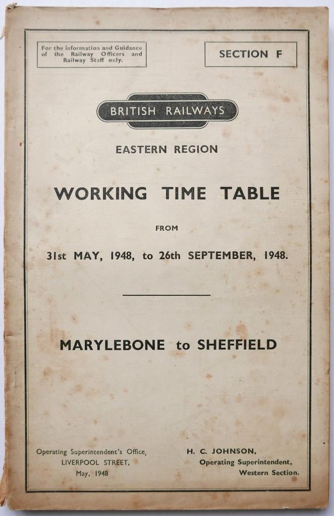 127 | BR(E) section F working timetable Marylebone to Sheffield. 138pp dated May 1948. Foxing to covers. | £55 |  |