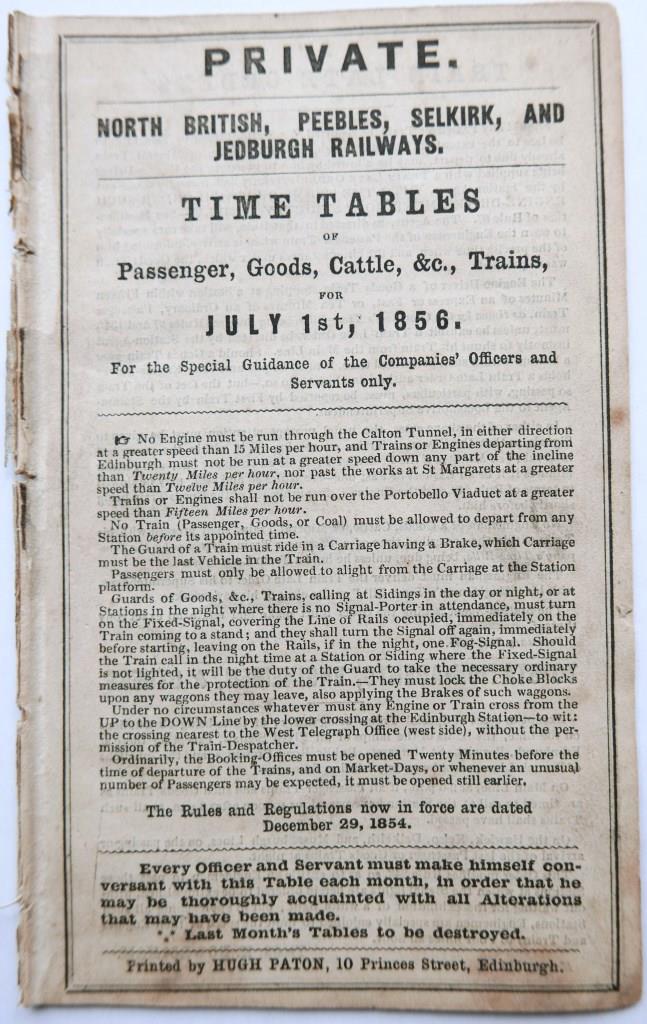 649 | North British, Peebles, Selkirk and Jedburgh Railways working timetable of passenger and freight trains. 24pp, dated July 1856. Disbound from larger volume. | £12 |  |