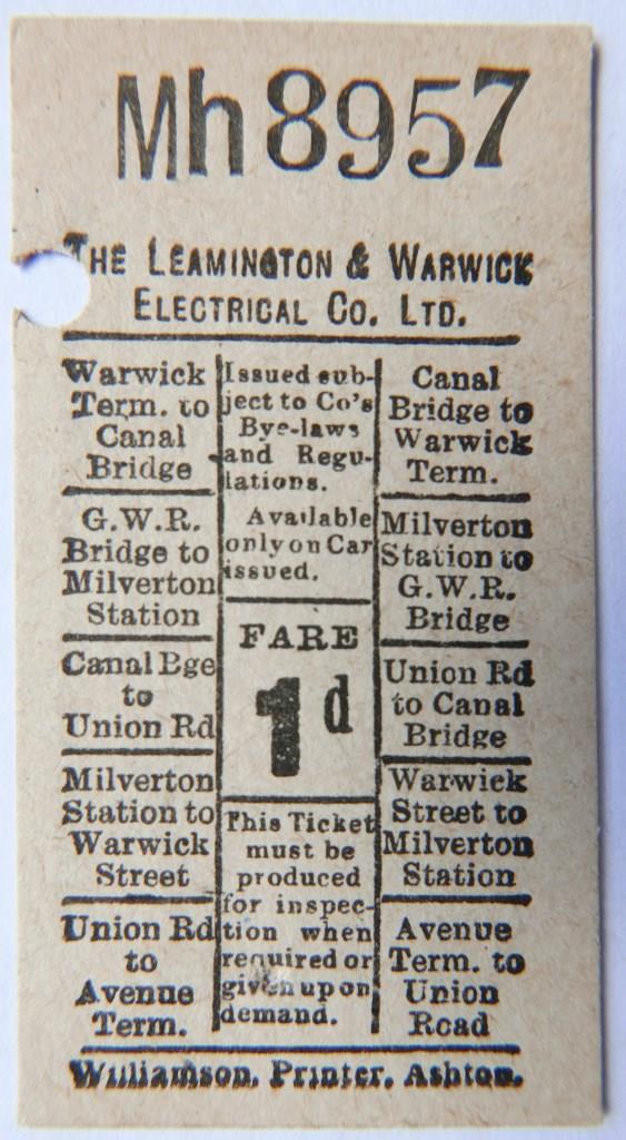 698 | Leamington & Warwick Electrical Company 1d geographical punch type ticket. | £24 |  |