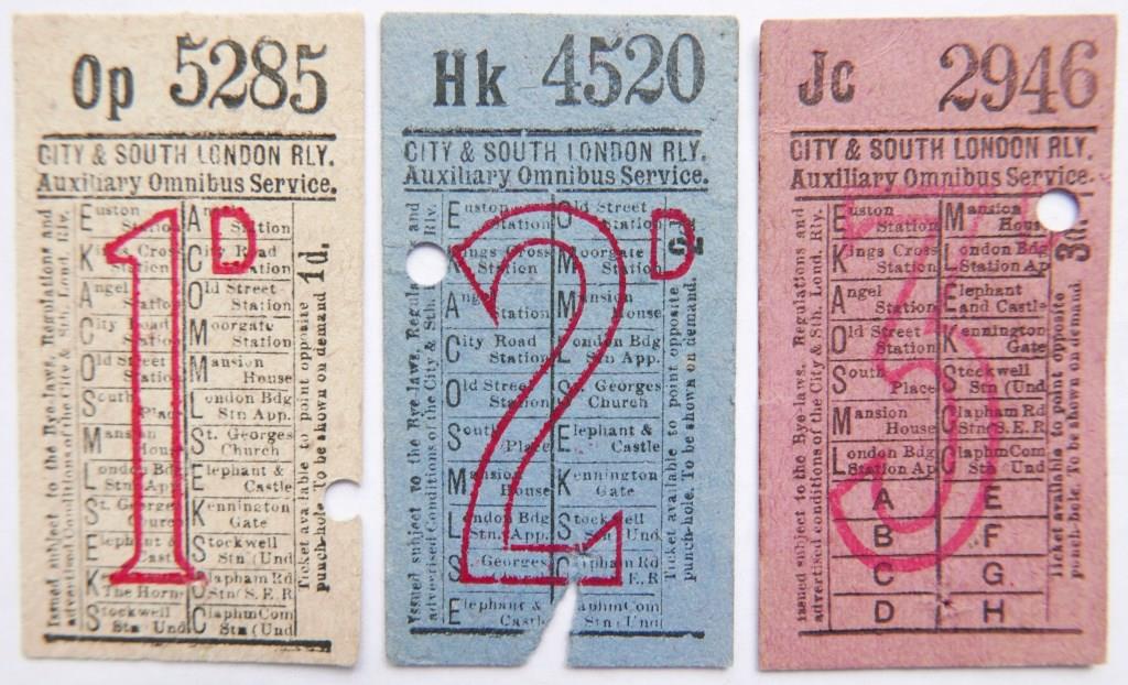 733 | 3 City & South London Railway Auxiliary Omnibus Service punch type geographical tickets. Values 1d, 2d, 3d. | £36 |  |