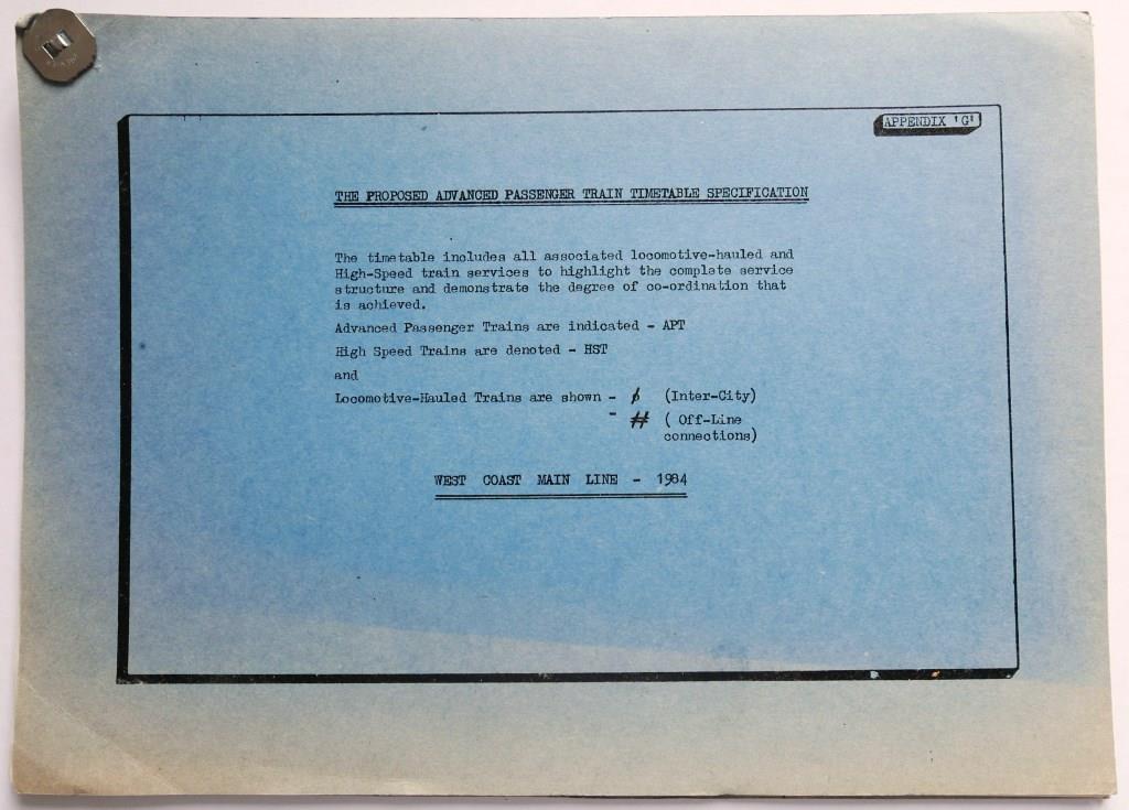 76 | BR timetable of proposed Advance Passenger Train WCML services, 1984. Blue card covers, 24 typescript pages. | £13 |  |