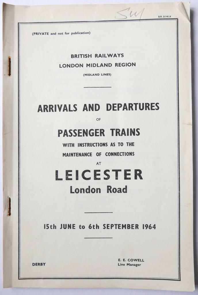 82 | BR(M) Midland Lines 38pp booklet ‘Arrivals and Departures of Passenger Trains – Leicester London Road’. Dated June 1964. | £42 |  |