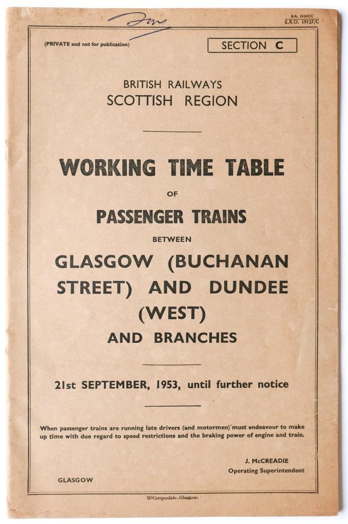 92 | BR(ScR) section C working timetable of passenger trains between Glasgow Buchanan Street and Dundee West and branches. 31pp dated September 1953. | £11 |  |