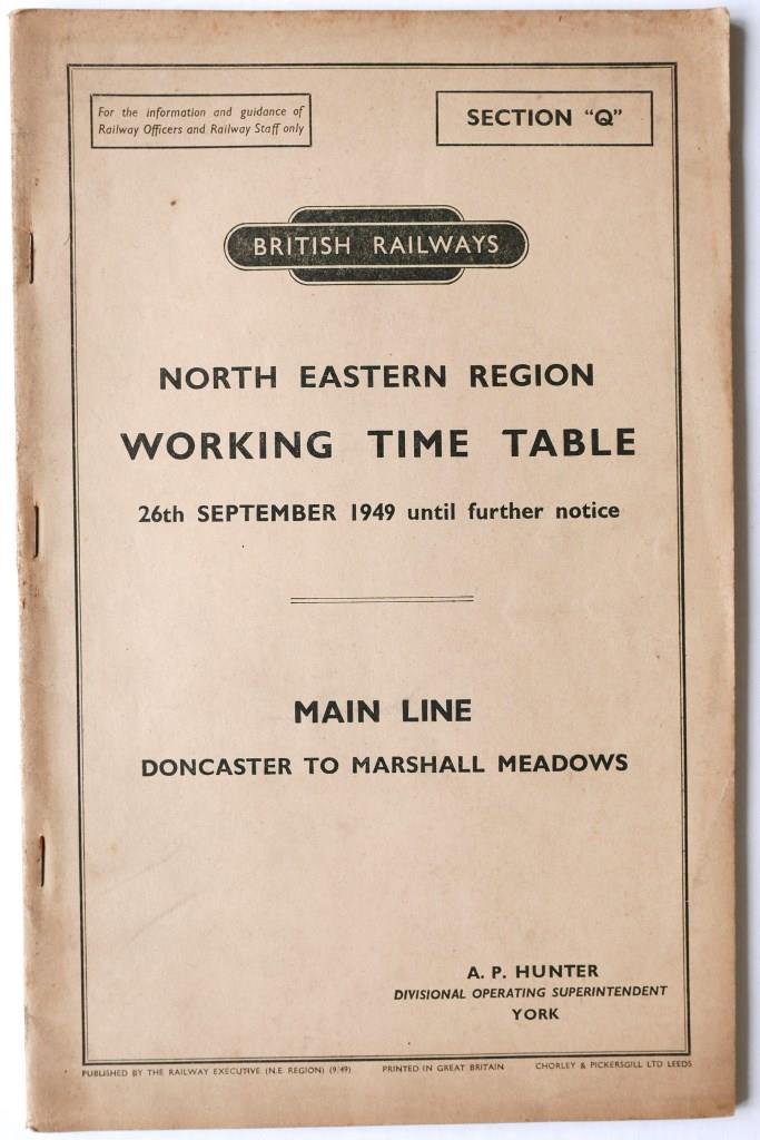93 | BR(NE) section Q working timetable Main Line Doncaster to Marshall Meadows. 98pp dated September 1949. | £11 |  |