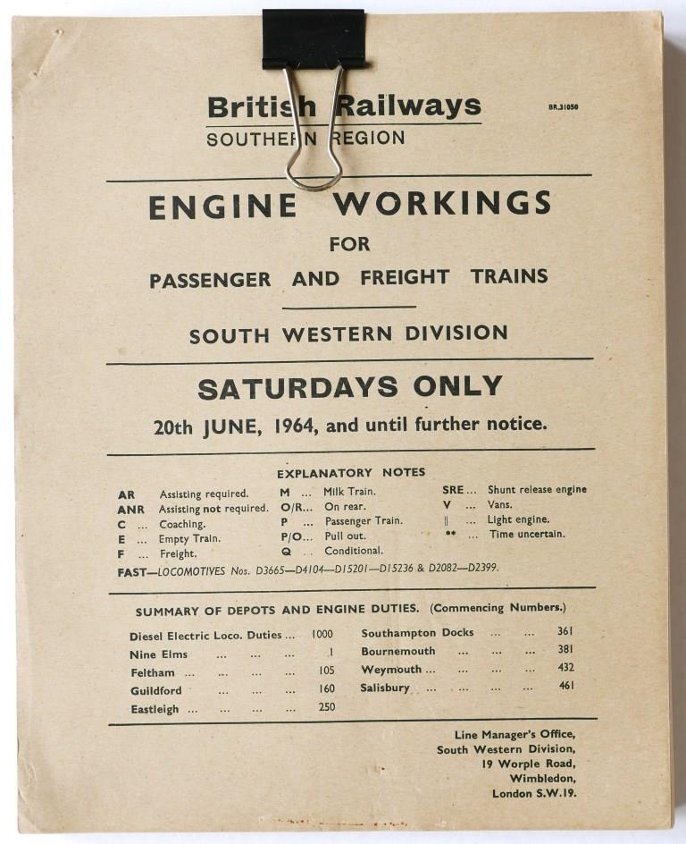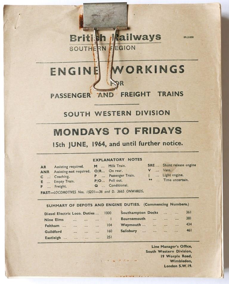 100 | BR(S) London (Western) and Southampton Districts booklet ‘Engine Workings for Passenger and Freight Trains – Saturdays Only’. Card covers, 179pp held by bulldog clip, dated June 1962. Covers worn, annotated alterations. | £130 |  |